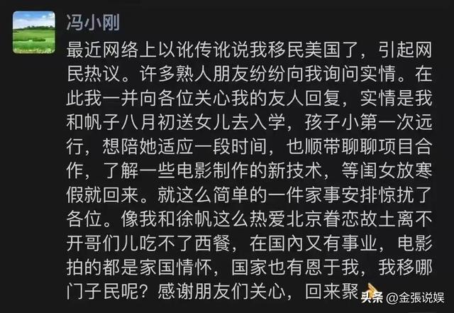 有网友在国外偶遇了冯小刚一家三口,于是移民美国的猜测开始发酵,还有人配合着爆料说冯小刚在海外置业购房,准备彻底离开国内。