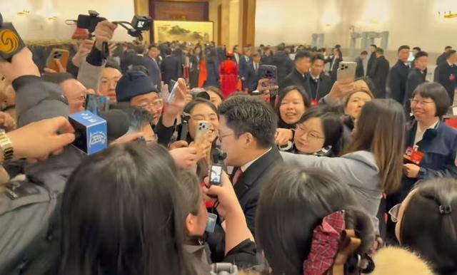 镜头、话筒密密麻麻凑到他面前,现场一度有些拥挤。